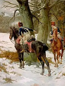 Malgré un sol neigeux et couvert de glace, le 15e hussards chargea sur environ 400 m au cri de « Emsdorf et la victoire ! », en référence à une bataille de 1760 durant laquelle le régiment s'était illustré. La température était si basse que nombre de hussards avaient enfilé leur pelisse plutôt que de la laisser suspendue à leurs épaules, certains étant même revêtus d'un manteau complet. Selon des témoins oculaires, les cavaliers étaient incapables de tenir correctement leur sabre et les rênes de leur monture du fait de leurs mains engourdies. Le choc entre les hussards et les chasseurs fut, malgré tout, d'une très grande violence ; un officier britannique relata : « hommes et chevaux furent renversés et un hurlement de terreur, entrecoupé de jurons, de gémissements et de supplications, put se lire sur tous les visages »[3]. La charge impétueuse des hussards britanniques perça les rangs des chasseurs, puis ceux des dragons qui s'avançaient en soutien. La cavalerie française fut disloquée et prit la fuite vers l'est, poursuivie par les Britanniques[9].