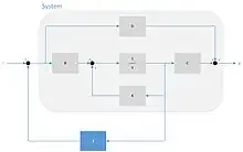 Le système ci-dessus n'a pas une représentation d'état linéaire du fait des signaux et . Une manière de les éliminer consiste à dériver les deux équations, et à choisir comme nouvel état et comme nouvelle entrée[13],[1].