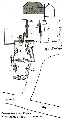 Il brûlait en 1524, restait ruiné jusqu'au XVIe siècle et fut désigné en 1656 comme étant un grand corps de logis en pierre de taille et un autre corps de logis respondant sur la rue, avec caves, chapelle, greniers, une cour et jardin. Saisie, elle fut vendue comme Bien national. Sur le plan ci-contre : le grand escalier cylindrique sur la gauche (D), desservait les deux bâtiments de la commanderie et l'escalier sur droit (E) dessert la cave. Le lieu (G) sur la rue était la cour de justice de la commanderie et séparé de celle-ci par une palissade. C'est en (K) que se trouvait la chapelle.