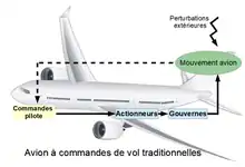 - Sur un avion à commandes de vol traditionnelles, le pilote contrôle l'avion en commandant un déplacement des gouvernes sur la base de ses sensations (vision de l'extérieur, lecture des instruments, retour d'effort dans le manche, perception des accélérations)