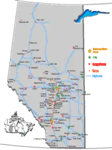 - (en) Cet article est partiellement ou en totalité issu de l’article de Wikipédia en anglais intitulé « List of communities in Alberta » (voir la liste des auteurs).