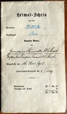 Jusqu'en 1988, le mariage entraîne pour l'épouse d'un citoyen suisse la perte de son lieu d'origine, remplacé par celui de son époux[14]. De 1988 à 2012, l'épouse conserve son lieu d'origine mais acquiert en sus celui de son époux. Depuis le , le mariage de deux citoyens suisses ne change pas les droits de cité de ces derniers[16].