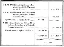 Ces actions, émises à 500 francs, reçoivent 40 francs d'intérêts la première année, puis les années suivantes également 40 francs sur les premiers bénéfices à distribuer, avant toute attribution aux actions anciennes, les deux types n'ayant de revenus égaux que si le produit de l'exercice permet de donner 40 francs au moins à l'ensemble des actions[C 15]. Dans le cas où le revenu d'un ou de plusieurs exercices ne pourrait pas payer 40 francs aux actions nouvelles, les dividendes non payés seraient prélevés par privilège sur les premiers revenus disponibles des exercices suivants, avant toute attribution aux actions anciennes[C 15].