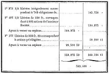 Le premier emprunt est de 152 500 francs[C 20]. Il a été réalisé par l'émission de bons à 6 %, remboursables après avertissement de six mois, et qui ont été souscrits par les principaux sociétaires. Le deuxième est voté par l'assemblée générale du 27 juillet 1871, et est émis en obligations de priorité de 200 francs, remboursables à 250 francs en vingt ans, depuis 1876 jusqu'en 1895, il a produit 647 250 francs, soit un total de 799 750 francs[C 20].