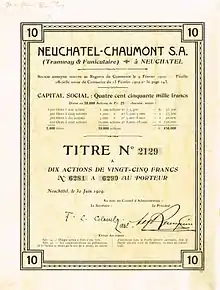 Elle reçoit en 1910, l'exploitation de la ligne de Neuchâtel (les Sablons) à La Coudre, concédée à la compagnie du chemin de fer Neuchâtel-Chaumont S.A. (Tramway & Funiculaire). Cette ligne lui sera ultérieurement cédée en 1943 [3].