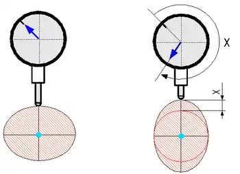 En faisant pivoter la pièce sur son axe, l'aiguille passera par un maximum. Le comparateur permet de trouver la valeur de l'ovalisation ainsi que la position de ce maximum. Par sécurité, l'opérateur continue la rotation de la pièce pour terminer le tour complet, et vérifier que l'aiguille revient bien au point zéro.