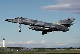 Sur le Dassault Super-Étendard, l'ensemble de la gouverne de profondeur est mobile. Les petits traits visibles devant donnent une idée de l'angle de la gouverne lorsqu'elle est au repos.