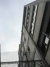 La façade côté rue est composée d'une trame donnant un rythme à la façade[4]. Un appartement est composé de trois alcôves de la trame. Une des trois alcôves accueille une loggia. Il y a deux modules de châssis différents, selon qu'il y a une loggia ou pas. Les baies sont constituées d'un assemblage d'éléments en bois préfabriqués avec des châssis et des garde-corps en métal. Les remplissages se font en Glasal (panneaux en amiante-ciment)[1].