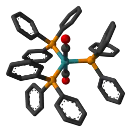 ![]() Structure 3D du complexe de Roper. La couleur des atomes est conventionnelle : - noir pour le carbone, - orange pour le phosphore, - rouge pour l'oxygène, - bleu pour le ruthénium. |