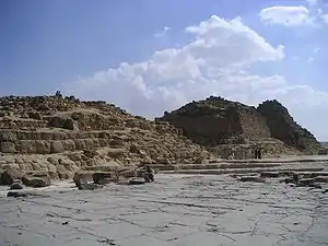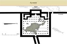 - d'un temple funéraire en deux parties, une basse appelée « temple de la vallée » et une partie haute située à proximité de la pyramide, ces deux parties étant reliées par une chaussée servant de galerie de communication[1] ;