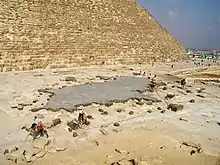 - d'un ensemble composé de la pyramide de Khéops, de trois pyramides de reines, d'une pyramide satellite, ceint d'une muraille, relié à la galerie de communication par l'intermédiaire de la partie haute du temple ; de celui-ci il ne subsiste qu'une partie du pavement en basalte d'une grande cour à ciel ouvert qui occupait l'essentiel du temple ;