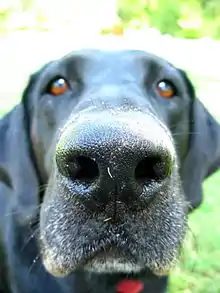 L'extérieur humide et spongieux de la truffe du chien lui permet de capter toutes les odeurs apportées par la brise[6]. La capacité de sentir avec chaque narine séparément (sentir en stéréo), lui permet de déterminer de qu'elle direction vient l'odeur pour que dès les premiers instants où il les renifle il commence à percevoir les choses qui s'y trouvent et où elles sont[6],[7].