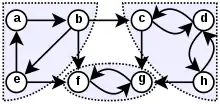 - il existe un arc (U, V) de H si et seulement s'il existe un arc (u, v) de G tel que u et v sont des nœuds respectifs des composantes fortement connexes U et V.