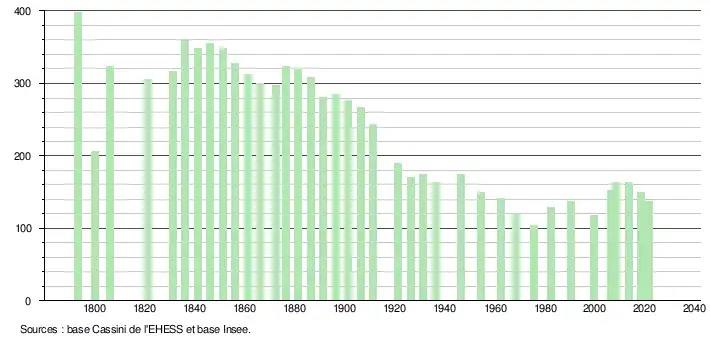 L'évolution du nombre d'habitants est connue à travers les recensements de la population effectués dans la commune depuis 1793. Pour les communes de moins de 10 000 habitants, une enquête de recensement portant sur toute la population est réalisée tous les cinq ans, les populations légales des années intermédiaires étant quant à elles estimées par interpolation ou extrapolation[19]. Pour la commune, le premier recensement exhaustif entrant dans le cadre du nouveau dispositif a été réalisé en 2008[20].