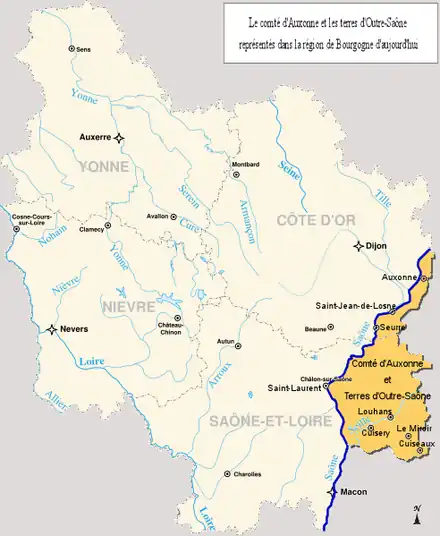 Courtépée[1] a écrit : « ... il est composé de tout le pays d’Outre-Saône, c'est-à-dire, des villes d’Auxonne, Seurre, Louhans, Cuiseaux, Saint-Laurent[2], Verdun[3], Cuisery, Pontailler, Bellevesvres et Chaussin ».