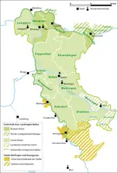 Le comté de Baden était divisé en onze « bailliages » (en allemand : Ämter) : huit dits « bailliages intérieurs » (en allemand : innere Ämter) et trois dits « bailliages extérieurs » (en allemand : äussere Ämter).