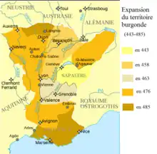 La basse vallée du Rhône connait diverses invasions. Wisigoths et Alains pillent de nombreuses cités et descendent jusqu'à Orange et Avignon. Les Burgondes s'installent dans la région en 442, et choisissent Vienne, qui gardait son prestige de grande cité romaine, pour capitale. Avignon marqua la pointe sud de ce royaume[23]. Mais en 484 à la mort du roi wisigoth Euric, les Burgondes franchissent la Durance et s'empare de toute la Provence, qu'ils restitueront aux Wisigoths en 501[24]. En 508, les Ostrogoths s'emparent à leur tour de la Provence fondent au sud de ce royaume Burgonde un duché dépendant de leur royaume italo-dalmate : le duché de Provence, future basse Provence ou comté de Provence (la partie burgonde deviendra elle le marquisat de Provence). En 536 ce sont les francs qui prennent possession du duché qui intégrera en partie dans le royaume franc de Bourgogne. Charles Martel combat le patrice de Provence, Mauronte, allié des Maures de Gothie et fait entrer définitivement la Provence dans le domaine franc en 736.