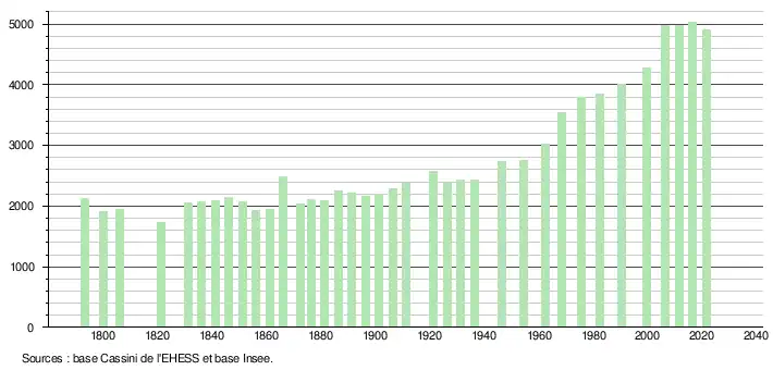 | L'évolution du nombre d'habitants est connue à travers les recensements de la population effectués dans la commune depuis 1793. Pour les communes de moins de 10 000 habitants, une enquête de recensement portant sur toute la population est réalisée tous les cinq ans, les populations légales des années intermédiaires étant quant à elles estimées par interpolation ou extrapolation[32]. Pour la commune, le premier recensement exhaustif entrant dans le cadre du nouveau dispositif a été réalisé en 2006[33]. En 2021, la commune comptait 4 905 habitants[Note 3], en diminution de 2,95 % par rapport à 2015 (Eure : −0,5 %, France hors Mayotte : +1,84 %). |