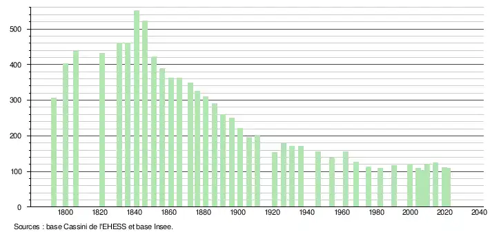 L'évolution du nombre d'habitants est connue à travers les recensements de la population effectués dans la commune depuis 1793. Pour les communes de moins de 10 000 habitants, une enquête de recensement portant sur toute la population est réalisée tous les cinq ans, les populations légales des années intermédiaires étant quant à elles estimées par interpolation ou extrapolation[44]. Pour la commune, le premier recensement exhaustif entrant dans le cadre du nouveau dispositif a été réalisé en 2004[45].