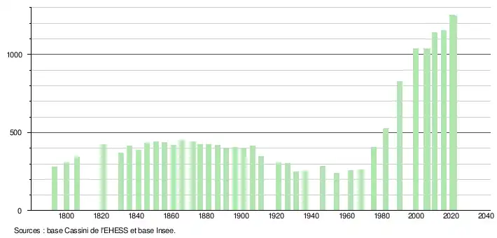 L'évolution du nombre d'habitants est connue à travers les recensements de la population effectués dans la commune depuis 1793. Pour les communes de moins de 10 000 habitants, une enquête de recensement portant sur toute la population est réalisée tous les cinq ans, les populations légales des années intermédiaires étant quant à elles estimées par interpolation ou extrapolation[25]. Pour la commune, le premier recensement exhaustif entrant dans le cadre du nouveau dispositif a été réalisé en 2005[26].