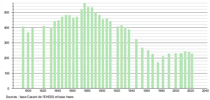 L'évolution du nombre d'habitants est connue à travers les recensements de la population effectués dans la commune depuis 1793. Pour les communes de moins de 10 000 habitants, une enquête de recensement portant sur toute la population est réalisée tous les cinq ans, les populations légales des années intermédiaires étant quant à elles estimées par interpolation ou extrapolation[35]. Pour la commune, le premier recensement exhaustif entrant dans le cadre du nouveau dispositif a été réalisé en 2007[36].