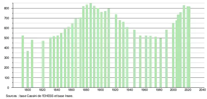 L'évolution du nombre d'habitants est connue à travers les recensements de la population effectués dans la commune depuis 1793. Pour les communes de moins de 10 000 habitants, une enquête de recensement portant sur toute la population est réalisée tous les cinq ans, les populations légales des années intermédiaires étant quant à elles estimées par interpolation ou extrapolation[17]. Pour la commune, le premier recensement exhaustif entrant dans le cadre du nouveau dispositif a été réalisé en 2004[18].