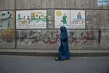 À l'issue de la guerre de 1992-1996, les talibans s'emparent du pouvoir. Sous l'émirat islamique d'Afghanistan (1996-2001), les droits des femmes régressent encore plus, celles-ci étant interdites d'étudier et d'exercer un métier. Le port de la burqa devient obligatoire ; les femmes ne le portant pas sont fouettées par les agents du ministère pour la Promotion de la vertu et la Répression du vice[11].
