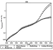 La conductivité translationnelle d'un mélange gazeux de corps est solution d'un système algébrique linéaire d'ordre et de rang [4],[6]. Elle s'exprime donc sous la forme où est la fraction volumique de l'espèce dans le mélange. Il existe nombre d'approximations précises dans un domaine plus ou moins large (voir figure ci-contre). Elles sont généralement basées sur une approximation de la solution formelle sous forme d'une série de déterminants. On obtient ainsi[7] :