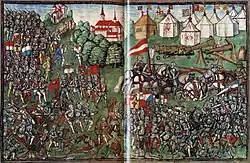 Les troupes autrichiennes, fortes de près de 4 000 cavaliers, qui ne représentent que l'avant-garde de l'armée de 25 000 hommes réunie pour l'occasion[23], se heurtent le aux 2 000 Lucernois, renforcés par des contingents uranais, obwaldiens, zurichois et schwytzois sur le plateau, près du village de Sempach qui donnera par la suite son nom à cette bataille[24].