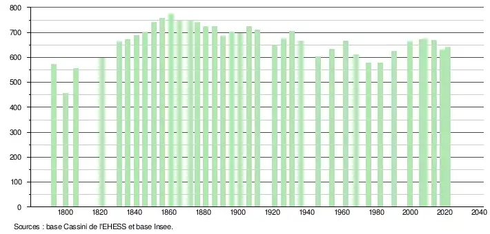 L'évolution du nombre d'habitants est connue à travers les recensements de la population effectués dans la commune depuis 1793. Pour les communes de moins de 10 000 habitants, une enquête de recensement portant sur toute la population est réalisée tous les cinq ans, les populations légales des années intermédiaires étant quant à elles estimées par interpolation ou extrapolation[20]. Pour la commune, le premier recensement exhaustif entrant dans le cadre du nouveau dispositif a été réalisé en 2008[21].