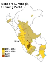 En , dans la province de Huancavelica, les sendéristes prirent en embuscade un convoi militaire et civil armés d'explosifs et de mitraillettes, démontrant leur capacité à attaquer et à infliger des dommages importants à des cibles faciles. Le bilan de l'attaque est de 12 soldats et 7 civils tués[11],[12].