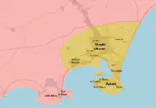 Les combats se déplacent ensuite à l'est d'Aden, dans les gouvernorats d'Abyane et Chaboua. Zinjibar, chef-lieu d'Abyane, est prise par les séparatistes le 20 août[21], mais Ataq, chef-lieu du gouvernorat de Chaboua, passe sous le contrôle des loyalistes le 24 août[22],[23].