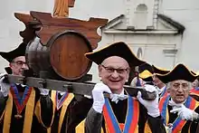 - Fête de la Saint-Vincent : Pour la Saint Vincent, patron des vignerons, le chapitre se déroule au mois de janvier, dans une commune angevine différente chaque année. La Saint Vincent débute par une cérémonie religieuse ayant pour but d' obtenir l'intercession du saint patron de la Confrérie pour les vignerons et pour la prochaine vendange[19].