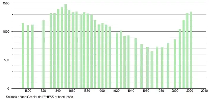 L'évolution du nombre d'habitants est connue à travers les recensements de la population effectués dans la commune depuis 1793. Pour les communes de moins de 10 000 habitants, une enquête de recensement portant sur toute la population est réalisée tous les cinq ans, les populations légales des années intermédiaires étant quant à elles estimées par interpolation ou extrapolation[22]. Pour la commune, le premier recensement exhaustif entrant dans le cadre du nouveau dispositif a été réalisé en 2006[23].