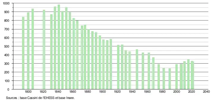 L'évolution du nombre d'habitants est connue à travers les recensements de la population effectués dans la commune depuis 1793. Pour les communes de moins de 10 000 habitants, une enquête de recensement portant sur toute la population est réalisée tous les cinq ans, les populations légales des années intermédiaires étant quant à elles estimées par interpolation ou extrapolation[19]. Pour la commune, le premier recensement exhaustif entrant dans le cadre du nouveau dispositif a été réalisé en 2005[20].