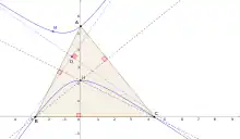 Selon la forme du triangle, certaines coniques de l'équation donnée peuvent changer de nature : si le triangle est acutangle, ce sera une ellipse inscrite, mais s'il est obtusangle, elle deviendra une hyperbole dont une des branches est tangente en un point de contact et la deuxième passe par les deux autres.