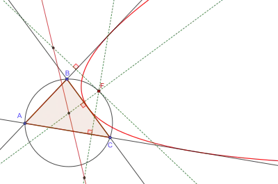 Du triangle ABC, on considère un point F de son cercle circonscrit, distinct de A, B et C. Alors la parabole de foyer F et de directrice la droite de Steiner de F est tangente aux trois côtés (étendus) du triangle.