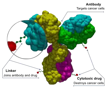 Les ADC sont des molécules complexes composées d'un anticorps lié à une charge utile ou à un médicament cytotoxique (anticancéreux) biologiquement actif[2]. Les conjugués anticorps-médicaments sont des exemples de bioconjugués et d'immunoconjugués.
