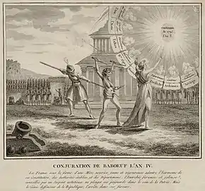 La Conjuration des Égaux (1796) est une tentative de renversement du Directoire menée par Gracchus Babeuf avec ses camarades (les Égaux), dans un contexte d'exaspération sociale due à la vie chère[2].