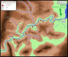 Le premier affrontement se produit sur l'Arar (aujourd'hui la Saône) début juin[23], que les Helvètes traversent alors. César, par l'intermédiaire de son lieutenant Labienus[23], tombe alors sur ceux qui n'ont toujours pas traversé, les prenant par surprise en désordre, et en tuant un grand nombre, le reste de l'armée helvète étant à l'abri sur l'autre rive[23]. Après ce combat, César fait construire ou terminer un pont sur la Saône pour poursuivre le gros de l'armée helvète épargnée[a 18]. Les deux chefs négocient tout d'abord (pour les Hélvètes : Divico des Tigurins, le célèbre vainqueur des Romains en selon César et Carcopino[24]). Il lui dit, sans s'assujettir, qu'ils sont prêts à suivre l'attribution des terres que César souhaite en échange de la paix. Le proconsul demande pour sa part des otages et que les Helvètes réparent les dommages causés chez les alliés de Rome, ce que Divico est contraint de rejeter[a 17],[a 19],[a 20],[24].