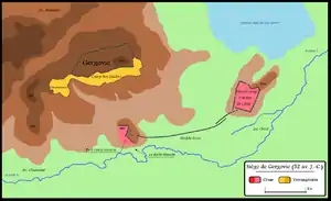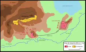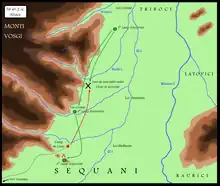 Les Séquanes s'unissent cette fois aux Éduens et autres peuples gaulois pour faire face. Le [a 23], une sanglante bataille épique se produit entre Gaulois et Germains à Admagétobrige. Après ces événements, Arioviste se conduit en despote envers ses vassaux gaulois. À la suite de cela, les Éduens envoient des ambassadeurs à Rome requérir de l'aide. Le Sénat décide d'intervenir et convainc Arioviste de suspendre sa conquête de la Gaule, par l'intermédiaire du consul de , Jules César, qui octroie au chef barbare le titre d'« ami du peuple romain »[a 24],[a 25],[a 26],[29].