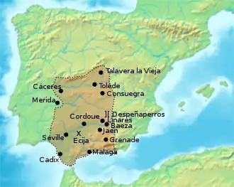 Tariq ayant établi une tête de pont dans le sud, Musa ben Nusayr, gouverneur d'Ifriqiya, débarque en Espagne la même année, avec une nouvelle armée de 10 000 à 18 000 hommes, d'origine arabe et syrienne[10],[11],[12], dans la ville de Cadix, et la place sous contrôle musulman. Les forces musulmanes, bien armées, conquièrent ensuite facilement, presque sans résistance, Medina-Sidonia. Puis elles vont assiéger Séville, mais celle-ci ne tombe qu'après un siège d'un mois.