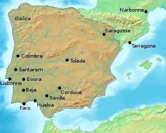 Au début du IXe siècle, les musulmans occupent la péninsule Ibérique, à l'exception du royaume des Asturies jusqu'en 925 et de la marche d'Espagne.