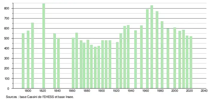 L'évolution du nombre d'habitants est connue à travers les recensements de la population effectués dans la commune depuis 1793. Pour les communes de moins de 10 000 habitants, une enquête de recensement portant sur toute la population est réalisée tous les cinq ans, les populations légales des années intermédiaires étant quant à elles estimées par interpolation ou extrapolation[25]. Pour la commune, le premier recensement exhaustif entrant dans le cadre du nouveau dispositif a été réalisé en 2006[26].