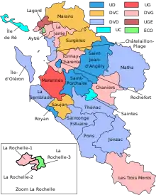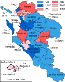 En 2014, le nombre de cantons est diminué au niveau national. En Charente-Maritime le nombre de cantons passe ainsi de 51 à 27[1] pour les élections départementales de 2015, où chaque canton est représenté par un binôme de conseillers départementaux. Le conseil général devient alors conseil départemental.