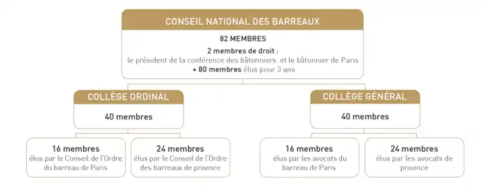 Le Conseil national des barreaux a reçu de la loi des missions très spécifiques et son fonctionnement est régi par les dispositions de la loi et du décret complétés par un règlement intérieur. Les 80 membres qui composent le Conseil national des barreaux sont des avocats désignés par leurs pairs au sein de deux circonscriptions (Barreau de Paris / reste de la France).