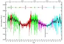 - l’activité solaire, qui fluctue selon un cycle de 11 ans, caractérisé par le nombre de taches solaires.