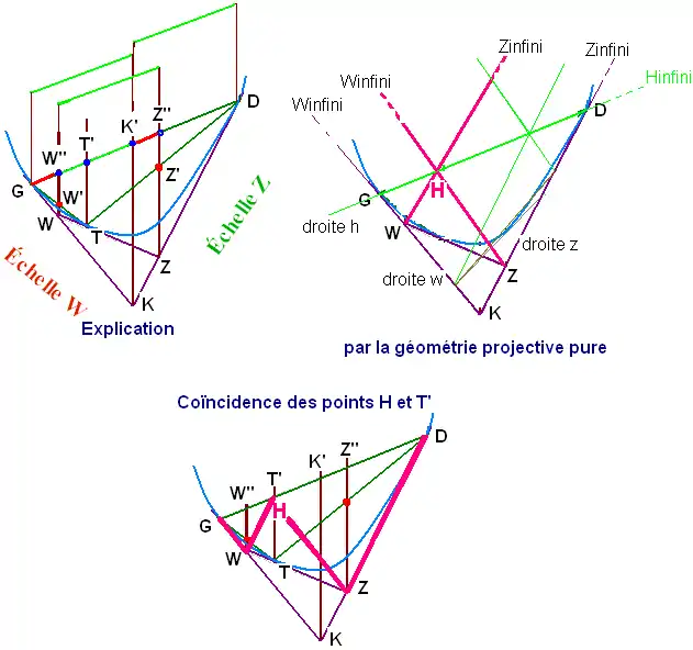 La correspondance homographique entre les alignements W et Z peut être construite d'une manière graphique, sans calculs analytiques, grâce à un parallélogramme variable KWHZ. Soit la transformation T définie comme la succession de 2 transformations de points projectives unidimensionnelles; la première est la perspective de centre Zinfini de la droite w sur la droite h=corde GD; la seconde est la perspective de centre Winfini de la droite h sur la droite z.