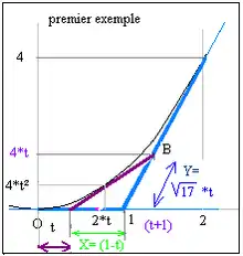 - Dans le premier exemple, la conique est la parabole y=x² qu'on appuie sur deux droites: la première est l'axe des abscisses, la seconde est la tangente à la parabole au point de coordonnées (2 , 4) ; une tangente variable, au point de la parabole ( 2t , 4t²), coupe ces deux droites aux distances (par rapport à leur coude) respectives et , le point B ayant comme coordonnées [(t+1), 4*t]. En éliminant le paramètre t entre ces deux équations nous obtenons la relation : , qui n'est qu'un cas particulier et dégénéré de la fonction homographique : , dans laquelle c=0, d=1, b=, a= .