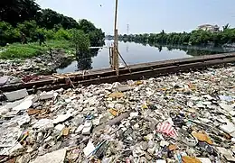Les déchets ménagers, agricoles, halieutiques, industriels et municipaux contiennent une part croissante de plastique, mal collectée et mal recyclée et partiellement valorisée thermiquement. S'y ajoutent les déchets transportés par les inondations, et les déchets générés par les guerres ou par des catastrophes naturelles (cyclones, tsunamis notamment). Ce sont ainsi environ 8 millions de tonnes de plastique par an qui arrivent en mer par an[20] ; et si la tendance se poursuit, cette masse pourrait atteindre 50 à 130 millions de tonnes en 2050, en raison surtout d'une consommation croissante de plastique dans les pays émergents qui n’ont pas encore d'infrastructures de collecte et de recyclage adéquates[19].